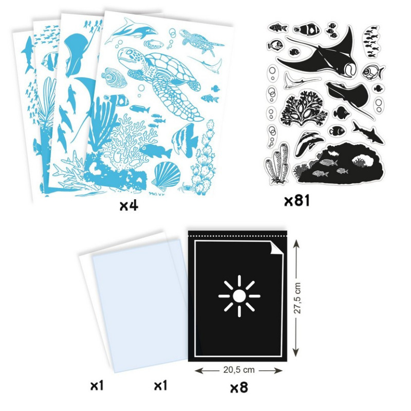 Zestaw artystyczny OCEAN oferuje zabawę techniką fotograficzną o nazwie cyjanotypia. Wykorzystując wybrane przez siebie nieprzezroczyste wzory, dziecko tworzy scenki na papierze światłoczułym. Po wystawieniu na działanie słońca, papier jest znakowany negatywowymi wzorami. Wystarczy opłukać papier w kąpieli z czystą wodą, a scena ukaże się na niebieskim tle! Wzory inspirowane naturą pozwalają stworzyć cztery prawdziwe dzieła sztuki przedstawiające podwodny świat. Dzięki załączonym mazakom można pokolorować powstałe rysunki.
