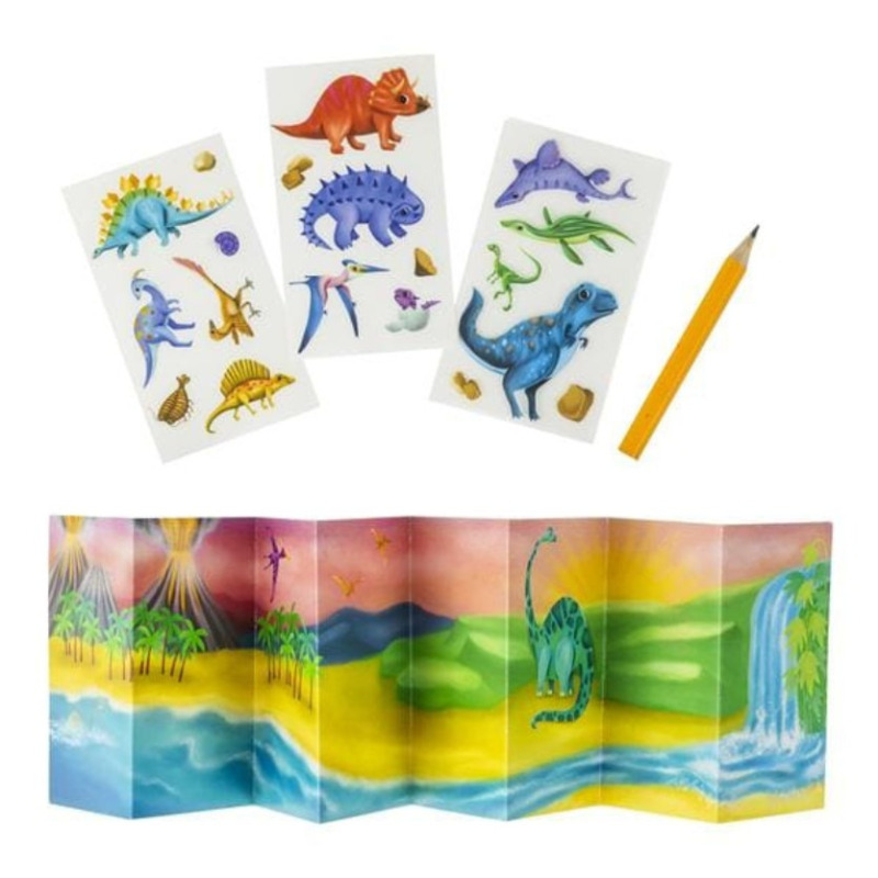Kompaktowy i gotowy do zabawy – w zestawie 3 arkusze naklejek transferowych, scena do opowiadania historii i mini ołówek do przenoszenia naklejek.