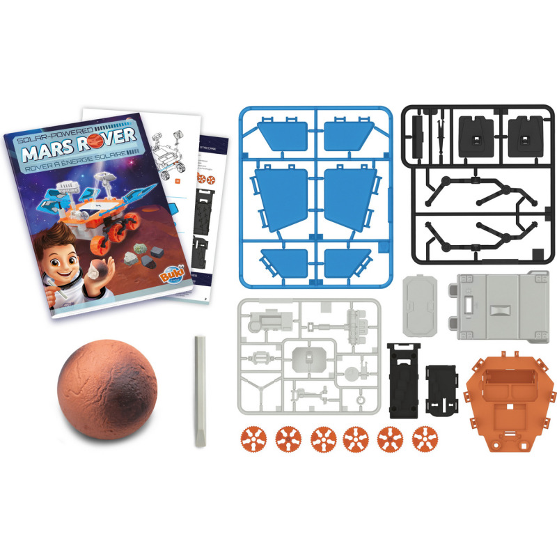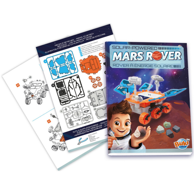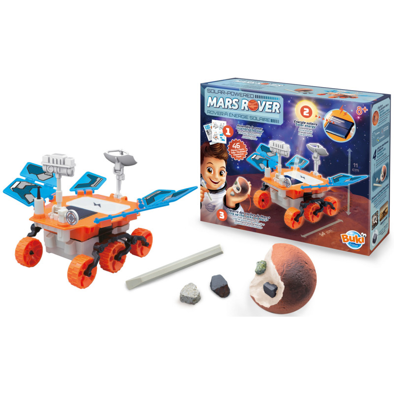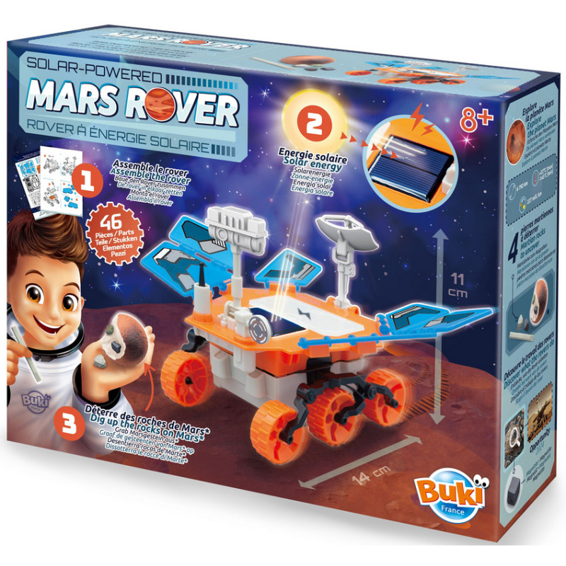 Czas na badania na Marsie! Łazik do samodzielnego złożenia od BUKI zachwyci każdego fana kosmicznej przestrzeni! Pojazd jest zasilany energią słoneczną lub za pomocą baterii, dzięki czemu można kontynuować zabawę nawet w pochmurne dni. W zestawie znajduje się dodatkowo blok gipsu w kształcie planety Mars. Można z niego wydobyć cztery autentyczne skały – andezyt, magnetyt, hematyt i oliwin – podobne do minerałów znalezionych na Marsie przez łaziki naukowe.
