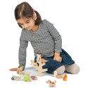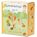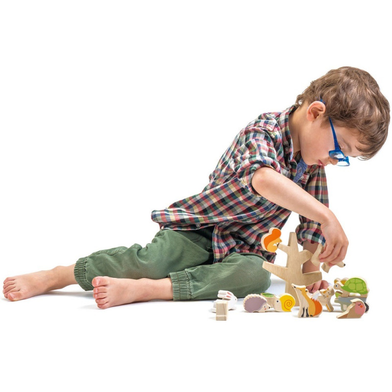 W zestawie drewniane drzewko, ślimak, wiewiórka, żółw,