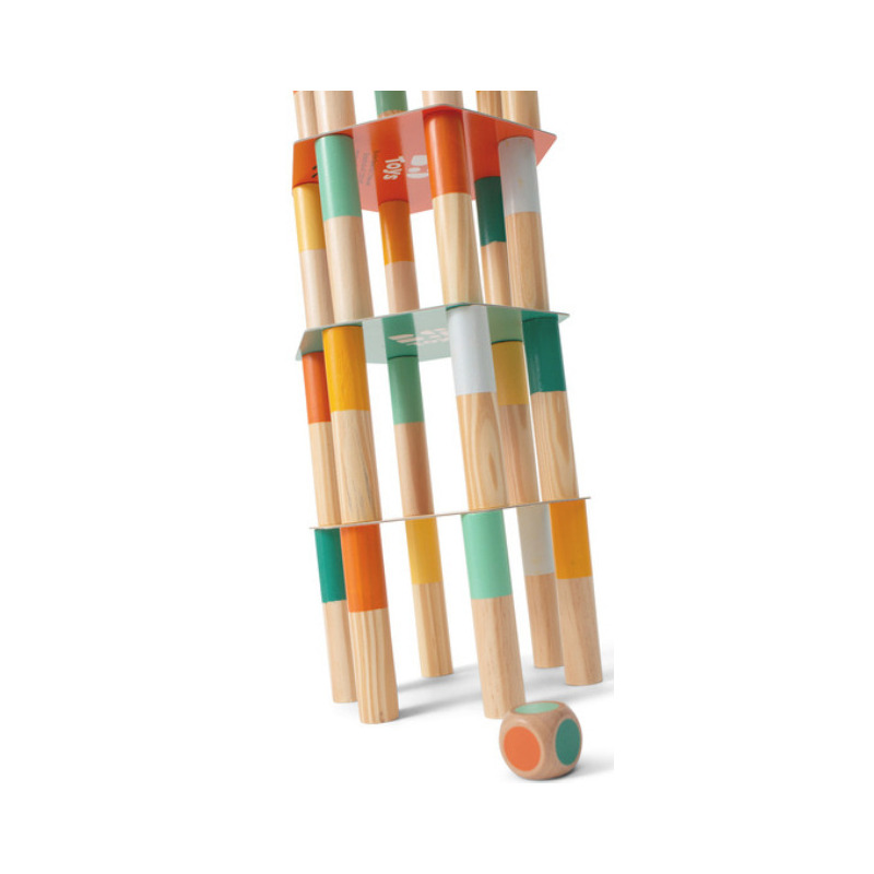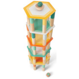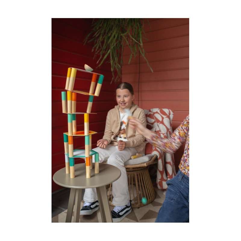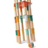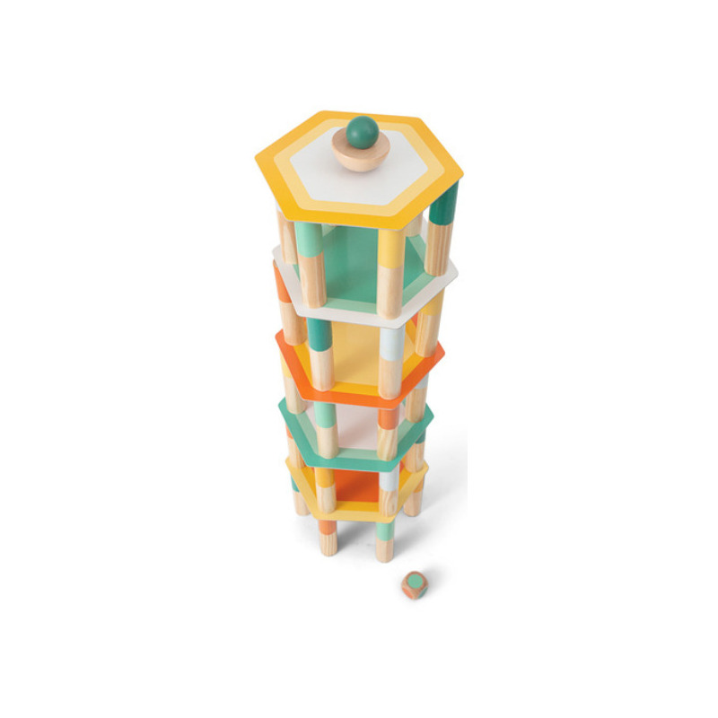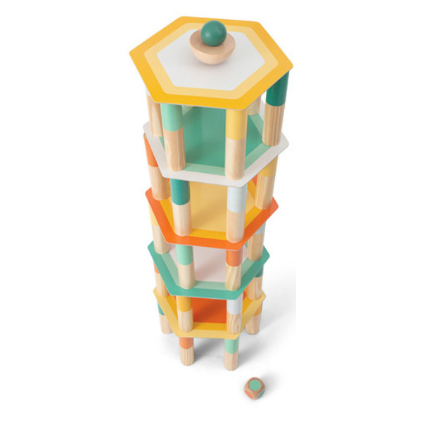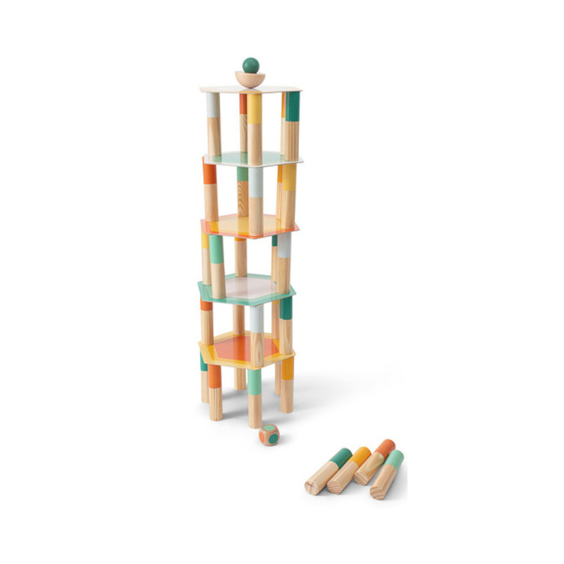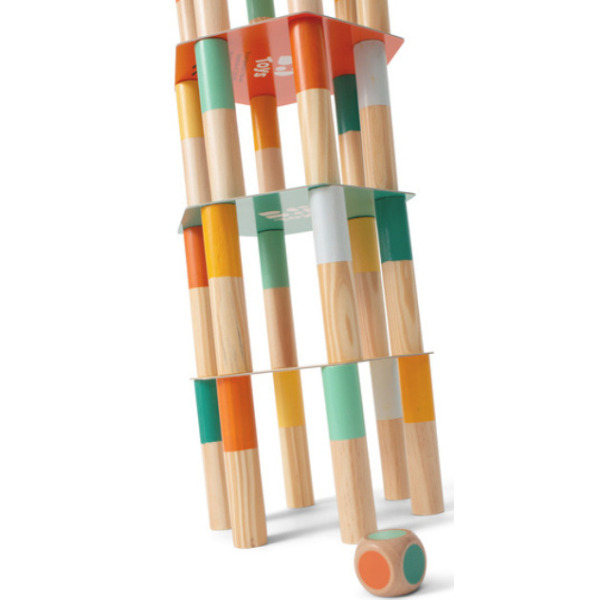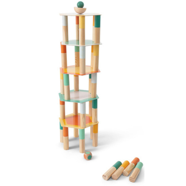 W zestawie: 30 drewnianych klocków (12 x 2,5 cm), 5 kart (17 x 20 cm), 1 drewniana kostka do gry, 1 drewniany element równoważni, 1 drewniana kulka.